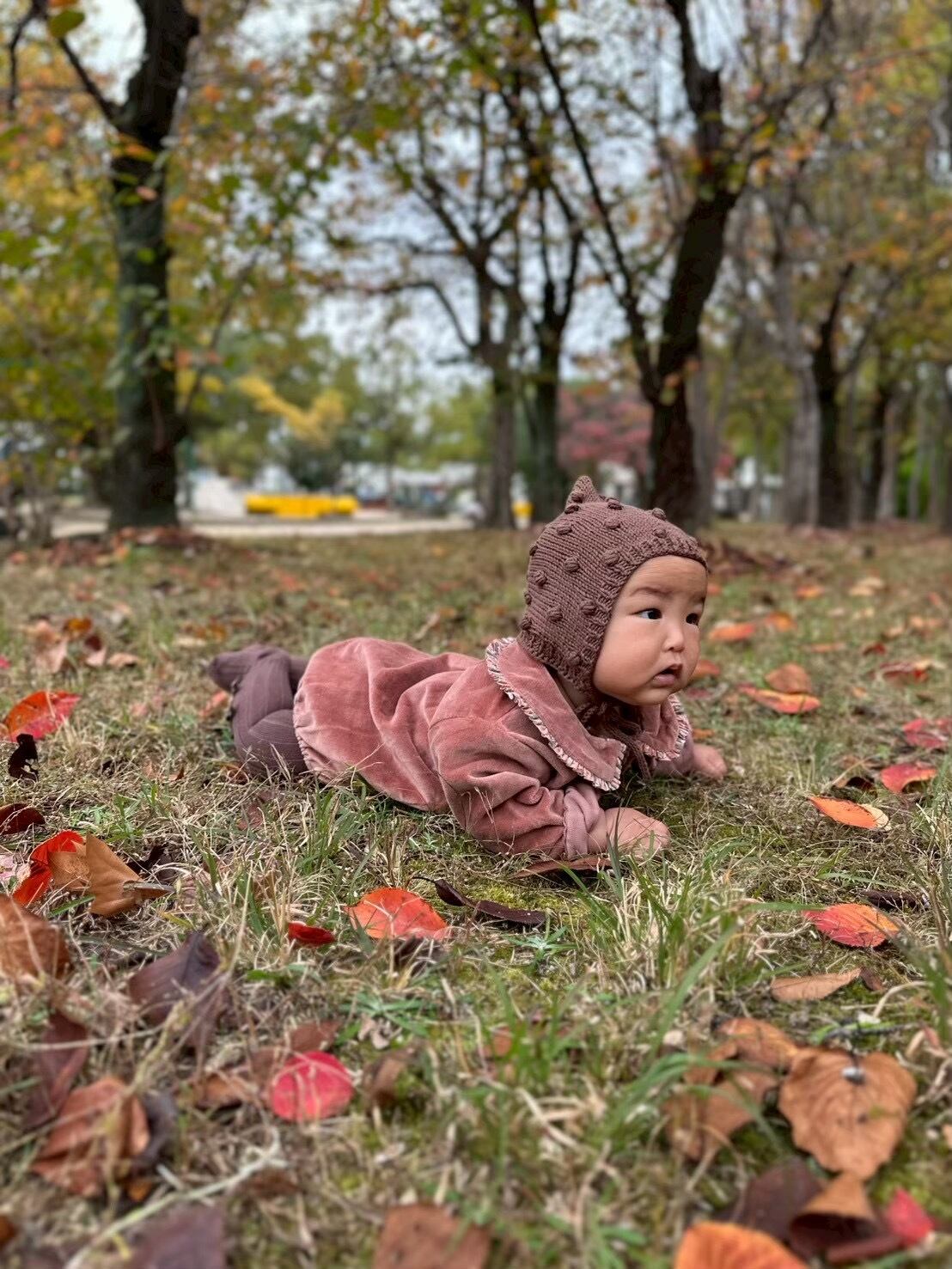 愛らしくて着心地の良い、このピンクのベロア素材のベビーロンパースは冬にぴったり。
